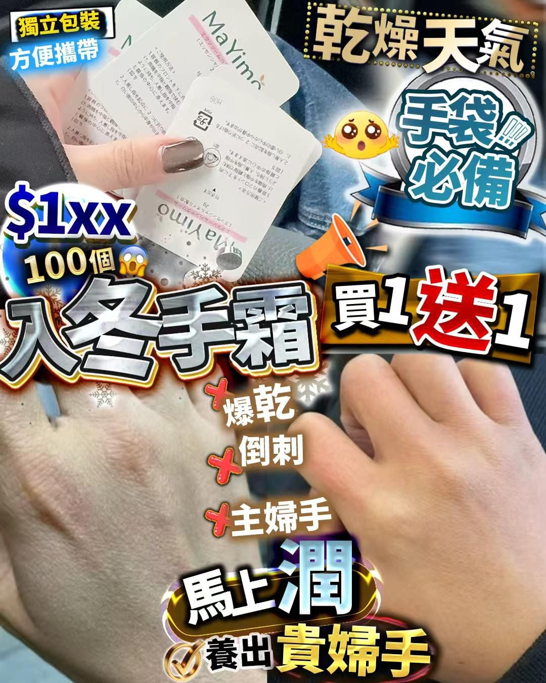 🌸 優惠價 $198/套; 一套:(2g*100 pcs) ✈️ 預計到貨日期 : 現貨 🔜售完即止‼️ ✨✨✨✨✨✨✨✨✨✨✨✨✨✨✨✨✨✨✨ 一星期回歸少女手 上幾星期 凍到手都龜裂 日日用 終於好返啦 😍😍 下星期再凍啲 手袋真係無手霜 搞唔掂 🥶 🌈入冬手霜用完你應該會將你本來手袋個一支放埋一邊 😆😆 一向唔會慳住用嘅我 呢個入冬手霜 一個我都用2次 $198 100 個 我個人真係用到200次 👍👍 第1批一到我都私留左幾套 慢慢用🙂↔️ 接受第2批 預訂中‼️‼️ 天氣越來越凍 隻手超乾 ❄️ 入冬手霜 獨立包裝 專為出街方便而設 👜 #入到手袋出得大場 ~ 真係唔怕迫爆手袋 👍👍 男士們 👦👦照顧埋你哋嘅需要 唔帶袋都拎到幾個出街 🤣 新品推廣 ❄️入冬價 $198 有100 個 🔥🔥 主婦手✅倒刺✅爆坼✅指甲邊緣厚皮 ✅ ❣️精油x乳霜x外泌體 滋潤度x 100000 ❣️ 1片=深層SPA💆♀️ 吸收快 幫雙手底層進行快速修復 精油滲透 - 親膚油脂穩定吸收 乳霜滋潤 - 封閉性強鎖住水潤 外泌體 - 強效用修復滋潤 幹細胞x 外泌體 : 促進皮膚修護和再生 加速促進膠原蛋白和彈性蛋白生成,減少細紋和皺紋,提升皮膚彈性 玫瑰精油:深層滋潤與保濕、軟化肌膚、淡化細紋、抗氧化、修復及預防手部龜裂問題 洋甘菊 :舒緩鎮靜肌膚、深層保濕滋潤,修護和強化肌膚屏障 角鯊烷:滋潤鎖水,活化細胞代謝機能 為每個細胞長期注水 紅沒藥醇:具有抗炎、舒緩和促進皮膚再生的特性。改善“主婦手”(手部濕疹或接觸性皮炎)症狀,特別有紅腫、瘙癢和乾燥的狀況 2g x 100 個 日本製 lrb